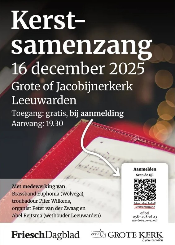 Het is inmiddels een vaste traditie: de Kerstsamenzang van het Friesch Dagblad in de Leeuwarder Grote of Jacobijnerkerk. Dit jaar is het kerstelijke meezingfeest op dinsdag 16 december.